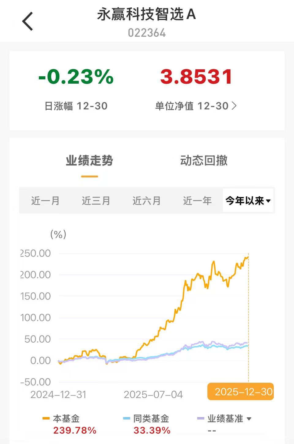 2025年基金业绩角逐已无悬念。任桀管理的永赢科技智选A,以累计239.78% 的年内收益率(截至12月30日)提前锁定年度基金冠军。 这是一个现象级的年度表现,永赢科技智选不仅一骑绝尘锁定年度基...