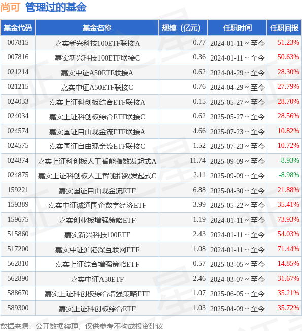 证券之星消息,2025年12月6日,嘉实中证新能源汽车指数(012543)发布公告,增聘尚可为基金经理,任职日期自2025年12月6日起,李直不再担任该基金基金经理,离任日期为2025年12月6日,...